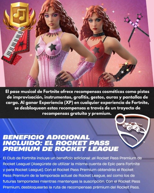 ⭐PASE ROCKET LEAGUE: El Club de Fortnite incluye un beneficio adicional: ¡el Rocket Pass Premium de Rocket League! (Asegúrate de utilizar la misma cuenta de Epic para Fortnite y para Rocket League). Con el Rocket Pass Premium obtendrás el Rocket Pass Premium de la temporada actual de Rocket League, así como los de futuras temporadas mientras mantengas la suscripción. Con el Rocket Pass Premium, desbloquearás la ruta de recompensas prémium del Rocket Pass.